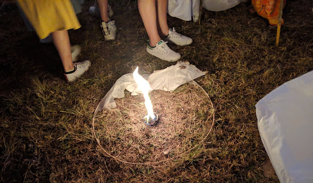 Impatience builds, and single lanterns start floating up into the sky. Between each performance, the frustrated MC calls out: "Do not floating the lanterns! Do not floating the lanterns! We want the beautiful picture!" I can only laugh; I have given up on the magical experience altogether.Finally, finally, the time comes to float our lanterns. This is not a one-person job, so I pair up with my new Colombian friend; all around me, strangers are helping each other out. As the lanterns start to rise into the night sky, I am enchanted; all fears of disappointment melt away.